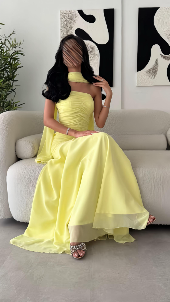 فستان سهرة أصفر بلون مشرق، يتميز بتصميم بكتف واحد مع طيات ناعمة على الصدر، وقماش شيفون انسيابي يمنح إطلالة أنثوية ناعمة ومفعمة بالحيوية.