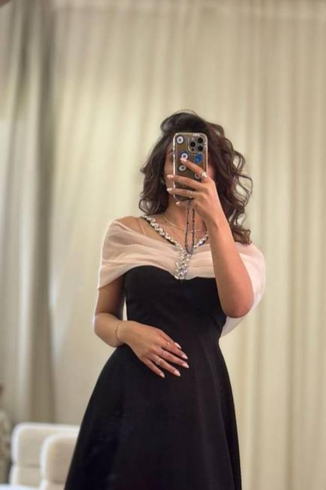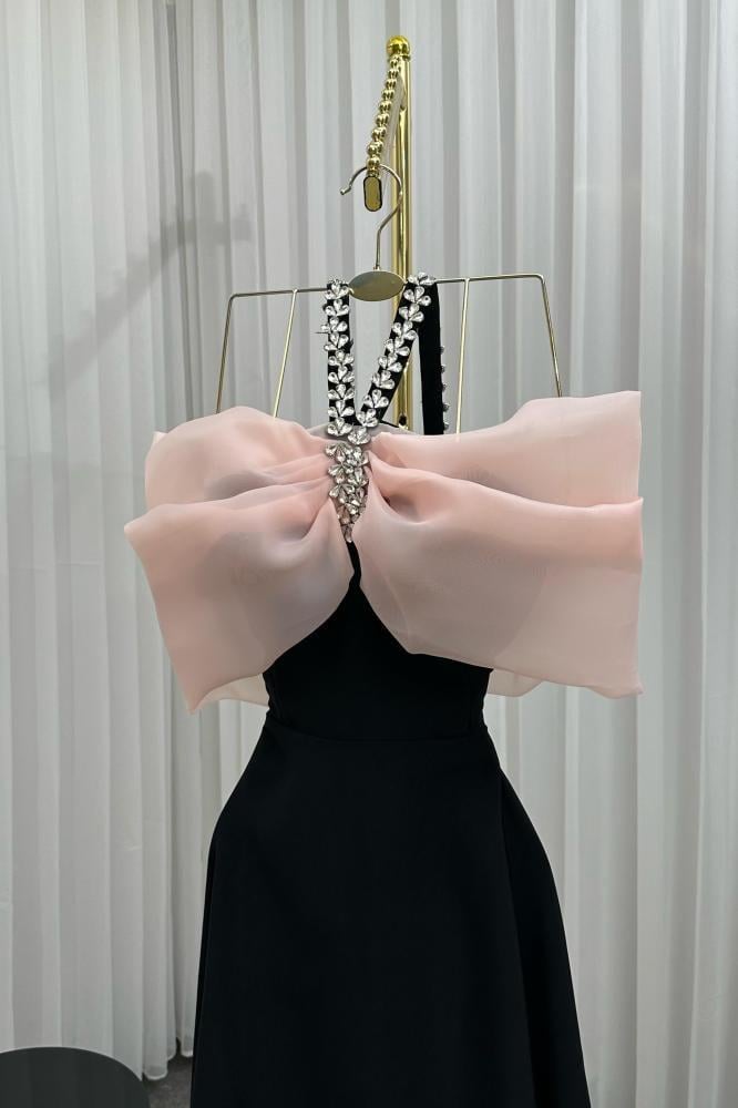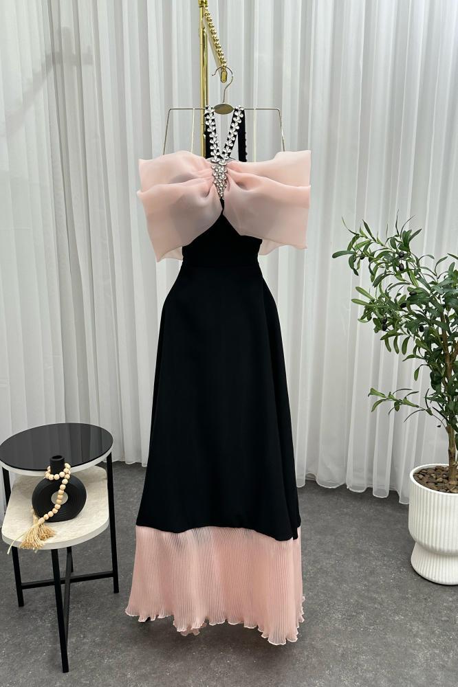 فستان يتميز بتصميم أنيق ومبتكر. الجزء العلوي يأتي باللون الأسود مع تفاصيل لامعة على شكل حرف "V" تضيف لمسة من الفخامة. في المنتصف، هناك فيونكة كبيرة باللون الوردي الفاتح تمنح التصميم جاذبية استثنائية. الجزء السفلي من الفستان طويل باللون الأسود وينتهي بطبقة من القماش الوردي المموج، ما يضفي طابعاً أنثوياً راقياً.