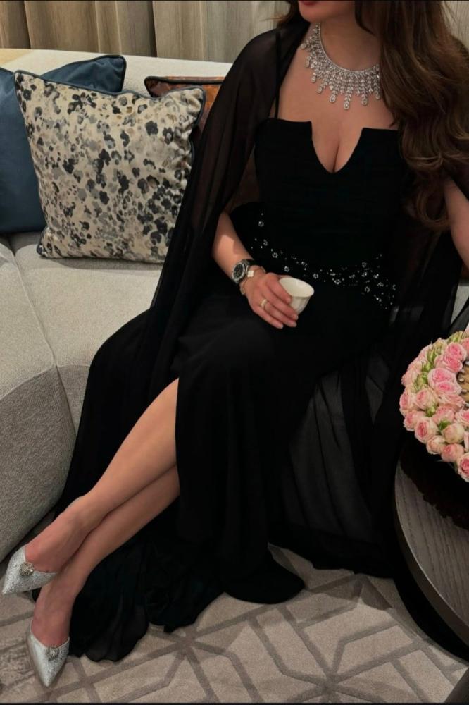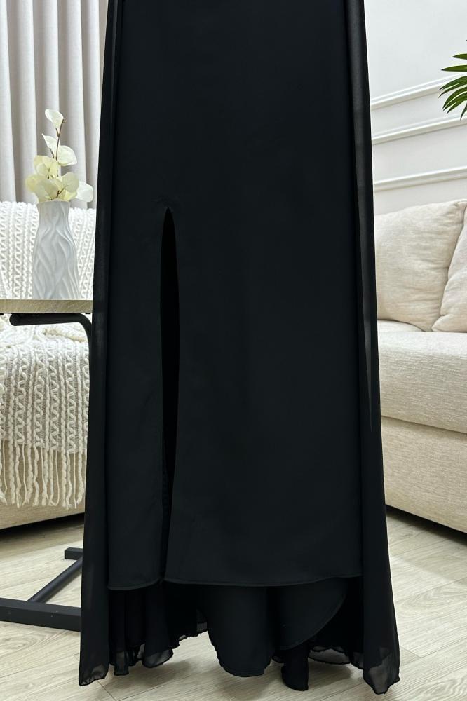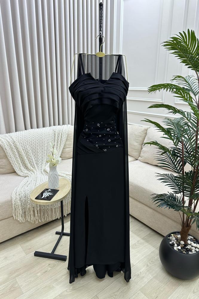 فستان سهرة أسود أنيق يتميز بتصميم أنثوي فاخر، بكتف مكشوف وكاب شفاف ينسدل بنعومة من الأكتاف. يزين الخصر تطريز لامع بأحجار متلألئة تضيف لمسة من الفخامة والرقي. التصميم يجمع بين الغموض والأناقة الكلاسيكية، مثالي للحفلات الفاخرة والمناسبات المسائية.
