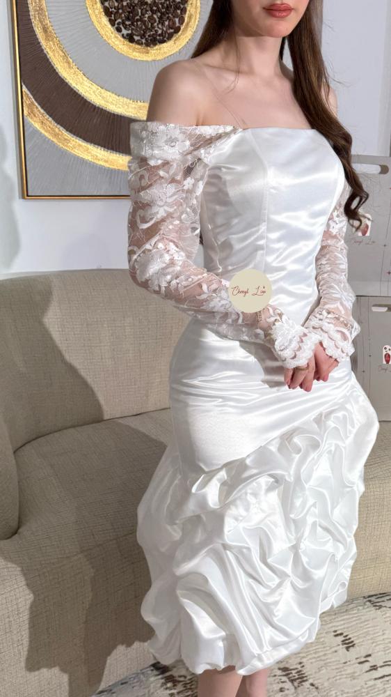 فستان ناعم بقصة ضيقة وإطلالة، يتميز بتفاصيل دانتيل دقيقة عند الكتف والخصر تعزز من أنوثته وجاذبيته.