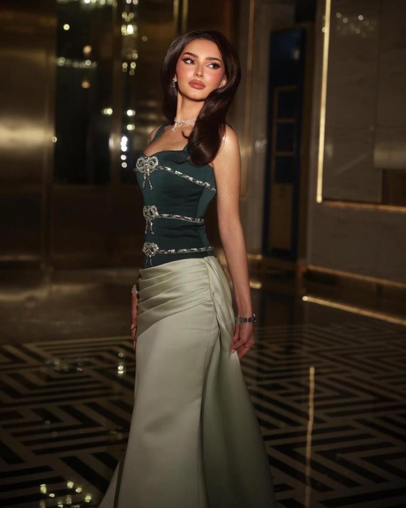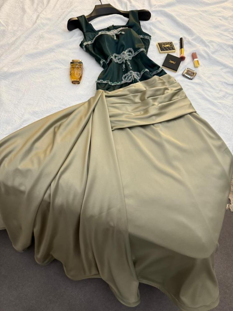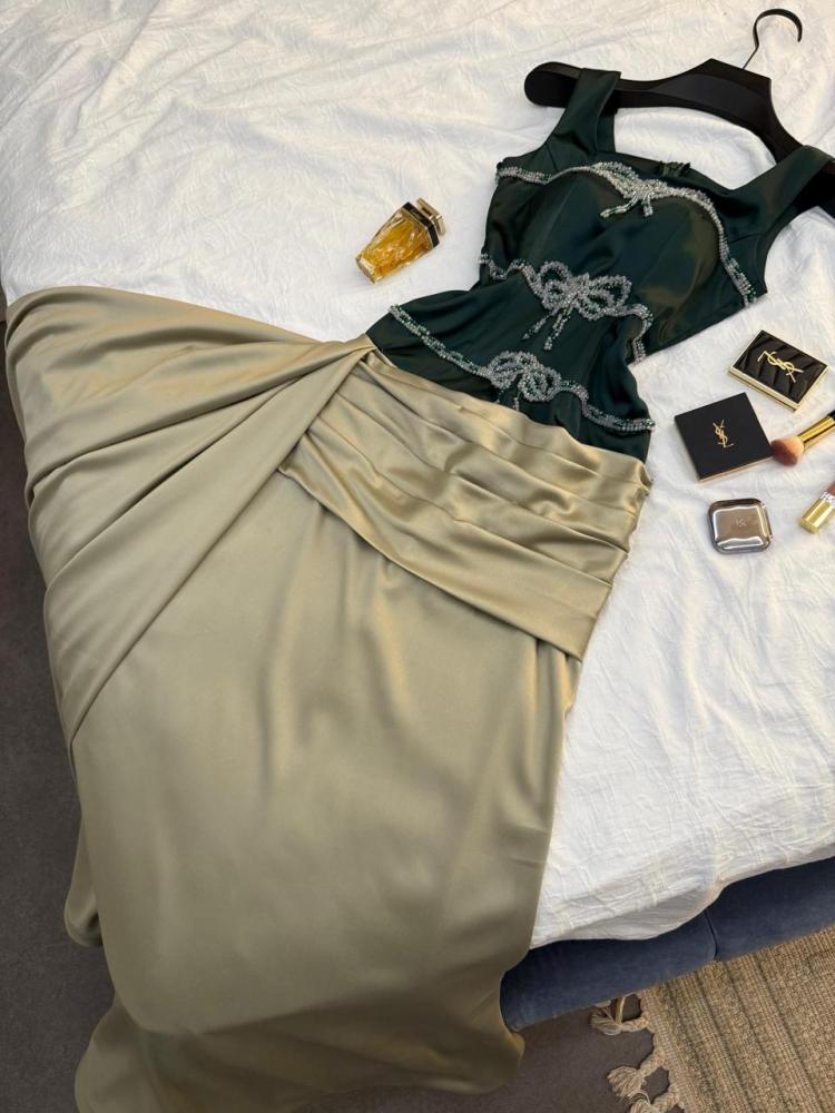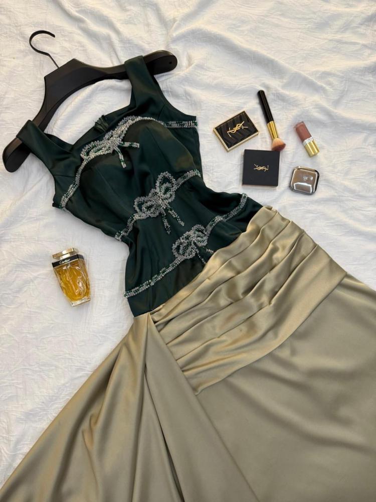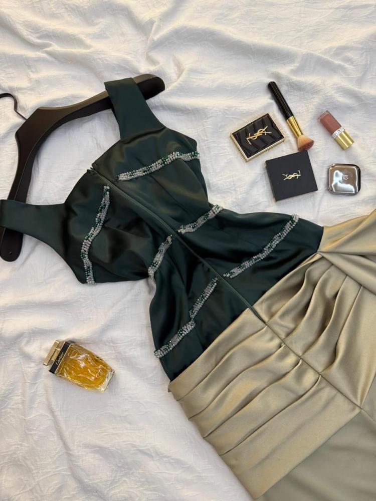 يتميز بتصميم جذاب يجمع بين اللون الأخضر الداكن في الجزء العلوي والذهبي اللامع في الاسفل. الجزء العلوي مزين بتطريزات دقيقة لامعة على شكل عقد وزخارف أنثوية تضيف لمسة من الفخامة