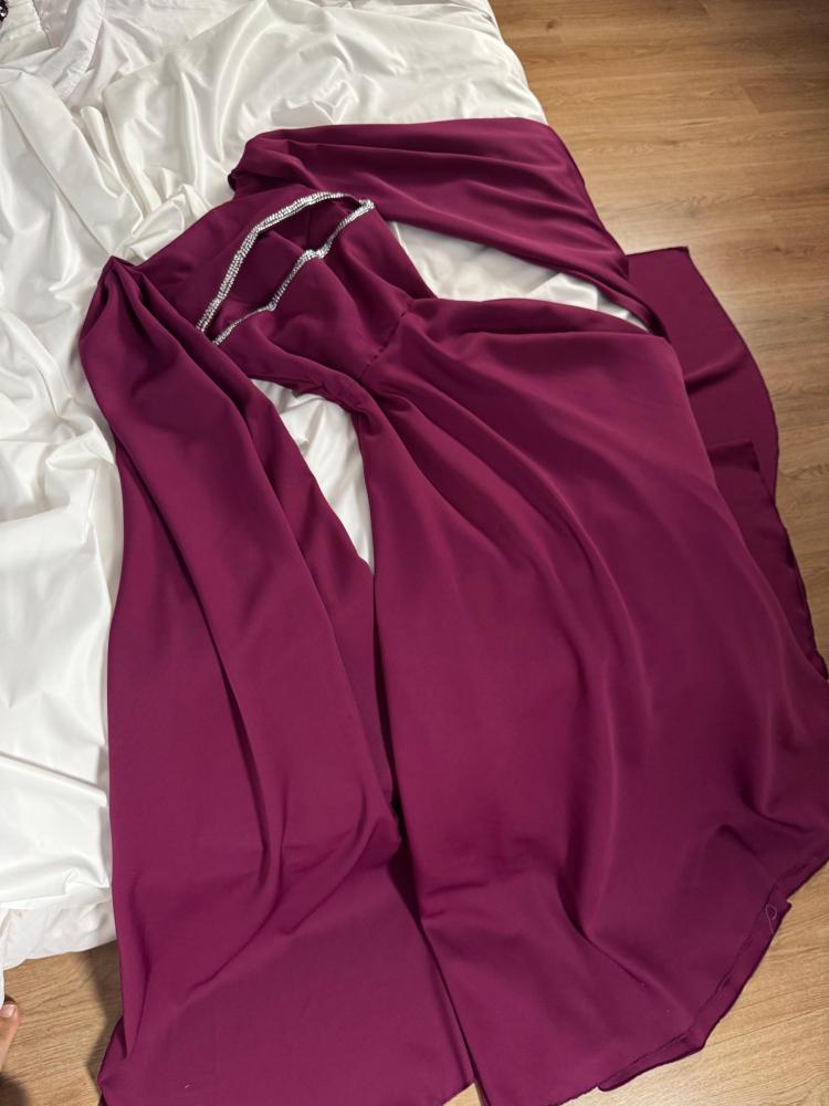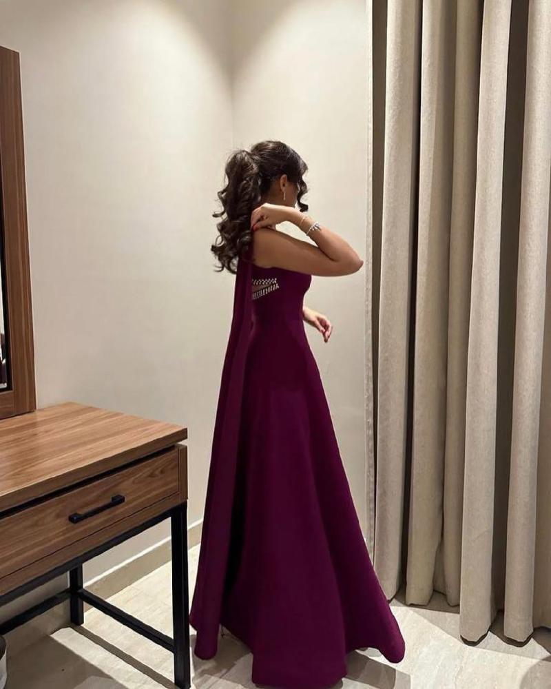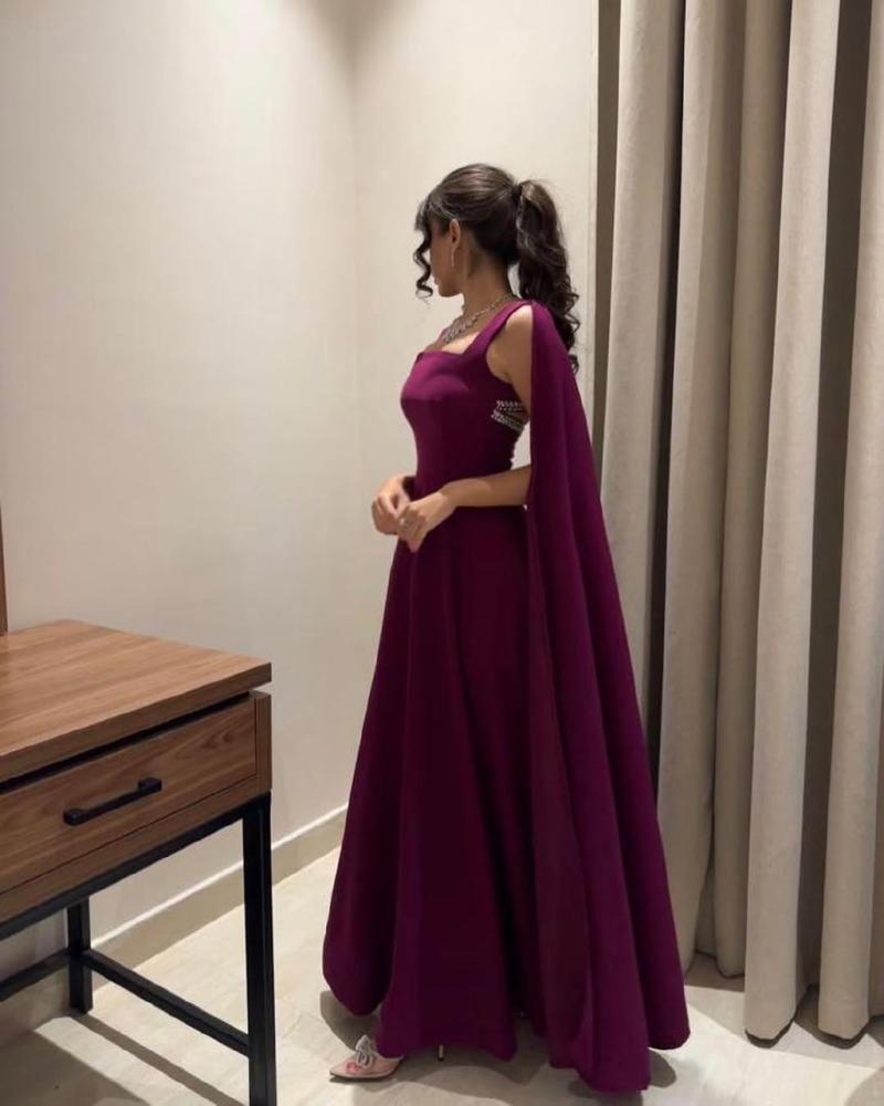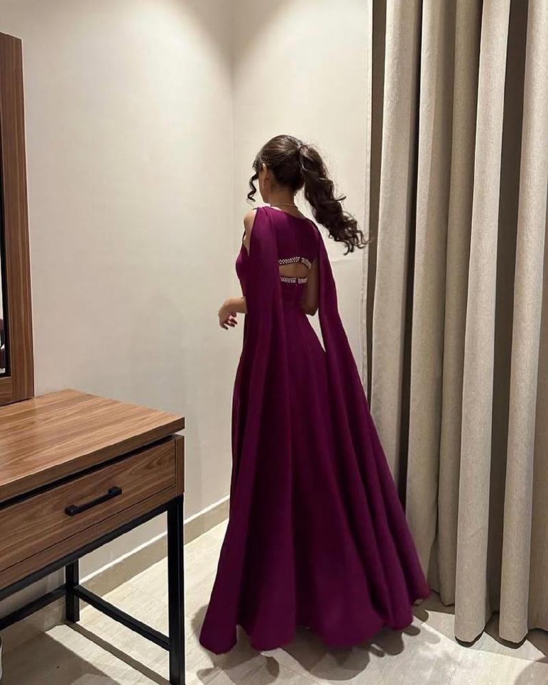 افستان سهرة أنيق باللون البنفسجي الداكن، يتميز بقصة ظهر مفتوحة مع تفاصيل لامعة، وتصميم كاب ينسدل بأناقة ليضفي لمسة ملكية على الإطلالة.