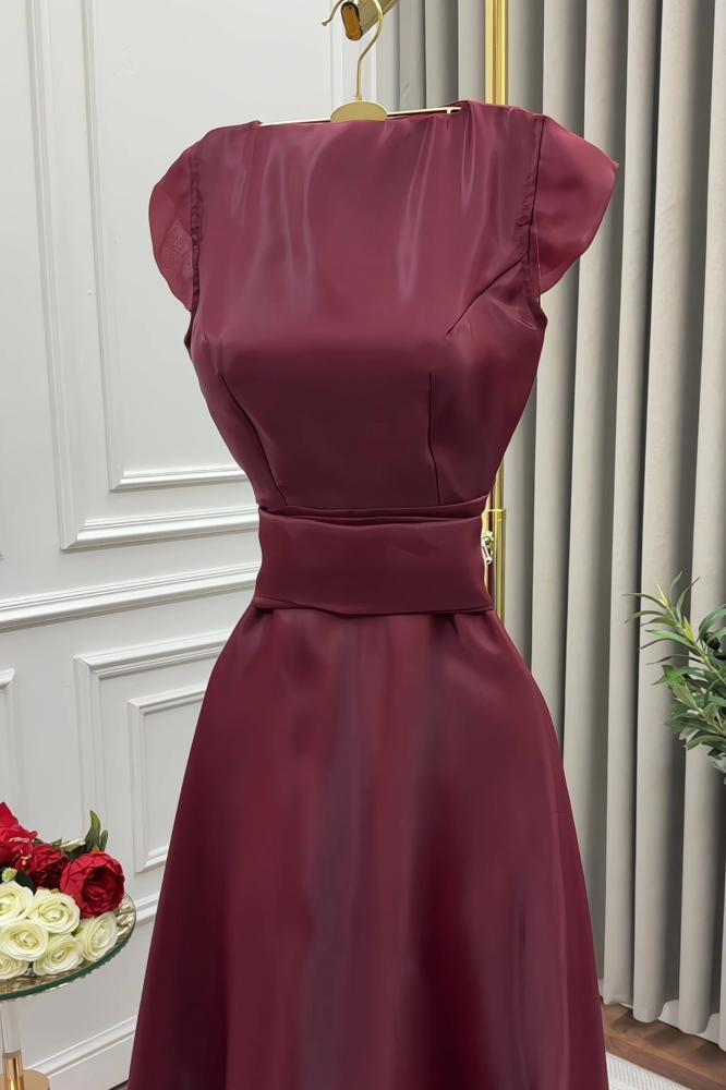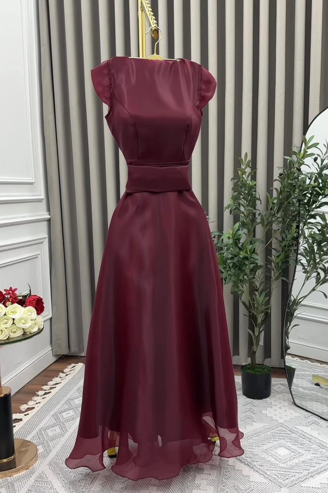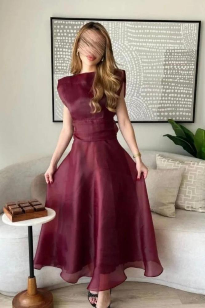 فستان طويل ولونه خمري. يتميز بتصميمه الأنيق والبسيط، حيث يحتوي على أكتاف عريضة بدون أكمام. القصة ضيقة عند الخصر، ثم تتسع تدريجيًا لتشكل تنورة واسعة تنسدل حتى الأرض. القماش يبدو شفافًا بعض الشيء، مما يضفي عليه لمسة انسيابية وخفيفة.