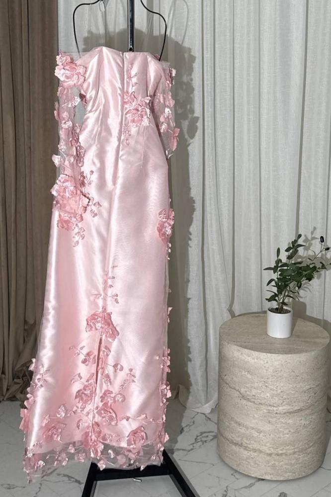 فستان وردي ميكادو بقصة مستقيمة، مزين بتطريز ثلاثي الأبعاد من الزهور الوردية وأكمام شفافة مطرزة تضيف لمسة أنثوية حالمة وأنيقة.